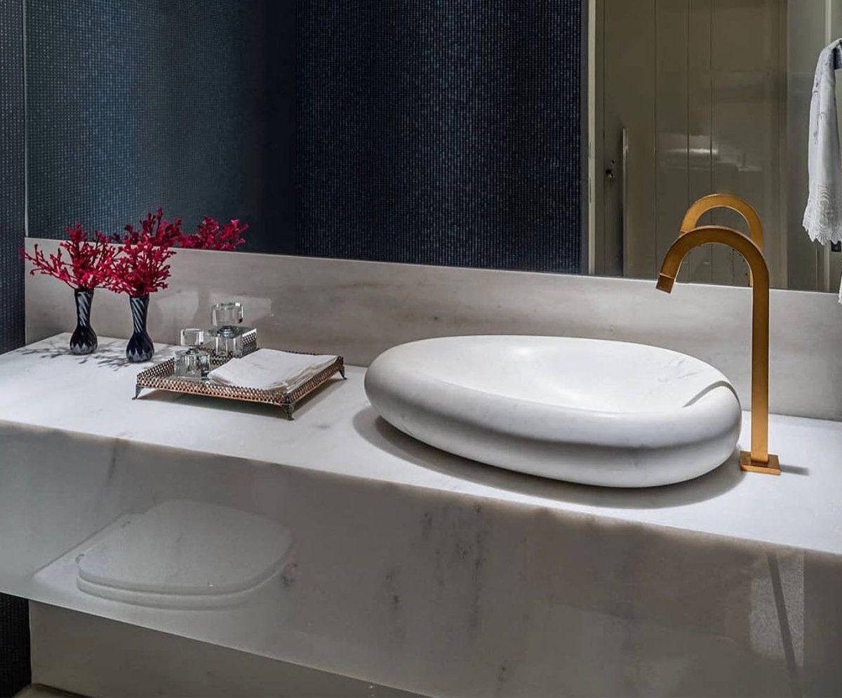 Apesar da cuba de banheiro em pedra esculpida em bloco único ser mais comumente conhecida, o item também valoriza muito a decoração de lavabos, cozinhas e áreas gourmet.
